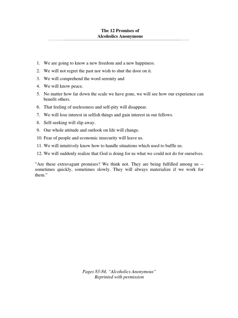 PROMISES If we are painstaking about this phase of our development we will be amazed before we are half way through. Printing a single copy of this item is permitted in accordance with AA. We are going to know a new freedom and a new happiness. 10th Step Promises Chapter 6 page 84-85 And we have ceased fighting anything or anyone even alcohol.